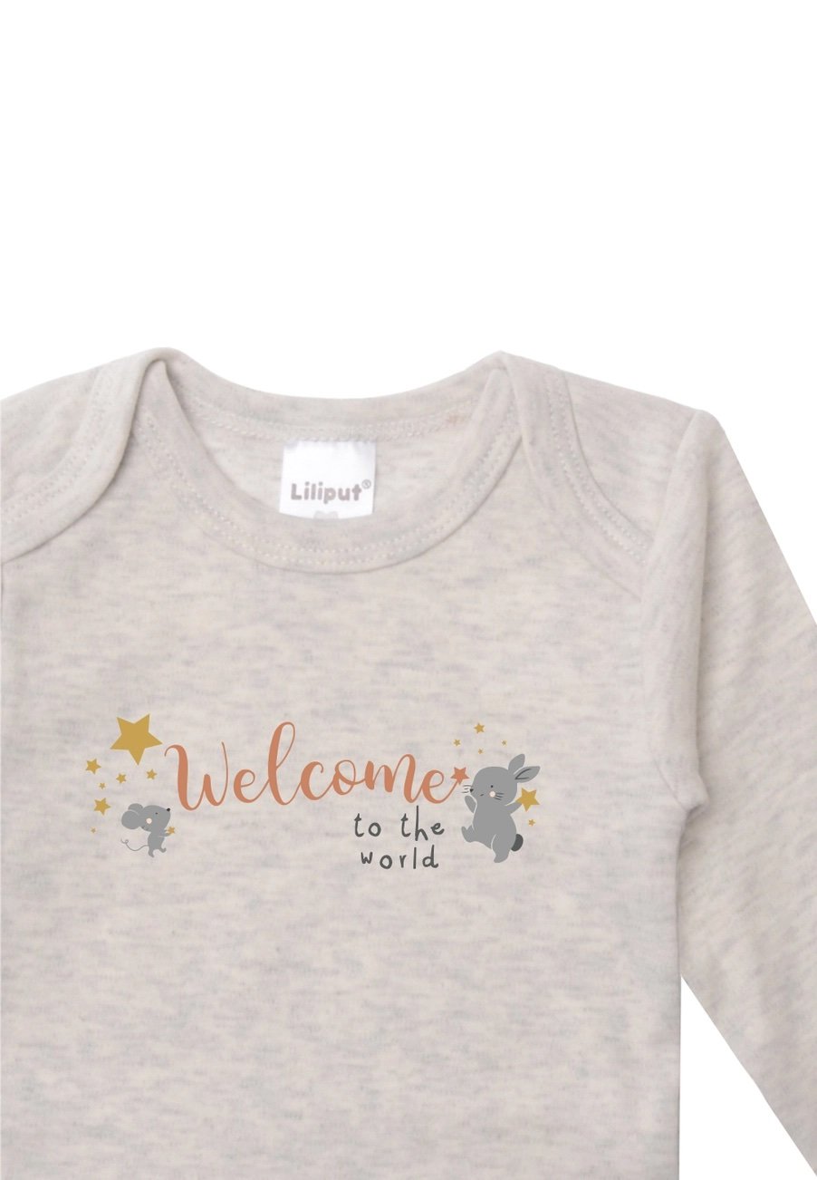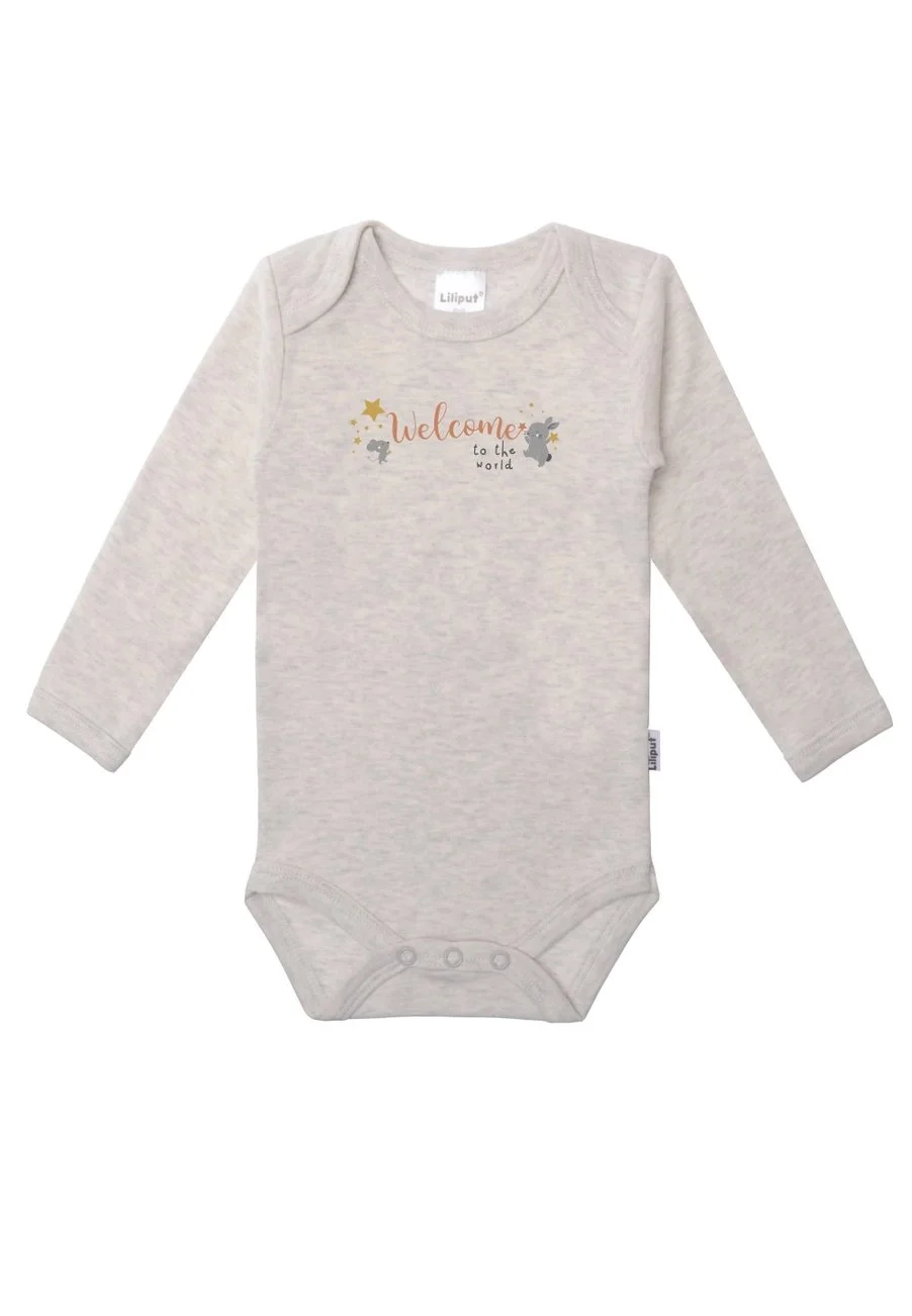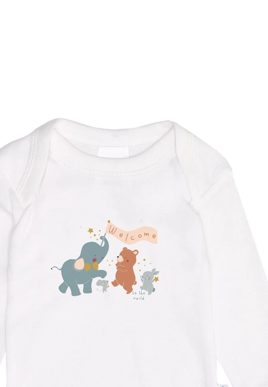Cute twin pack of long-sleeve bodysuits with an envelope neck in pleasantly soft cotton quality. One bodysuit is white and features the print "Elephant, Bear, Rabbit, and Mouse say Welcome," while the other bodysuit is in a simple gray melange and has the print "Welcome to the world." Both bodysuits have 3 snap buttons at the crotch, making it easy to put on and take off. Comfortable to wear due to high-quality cotton.