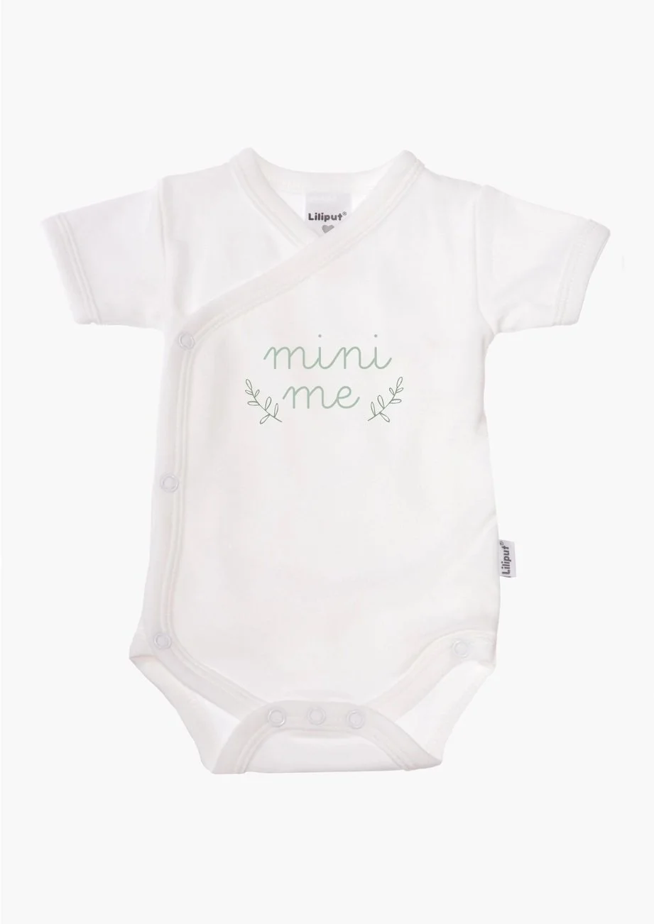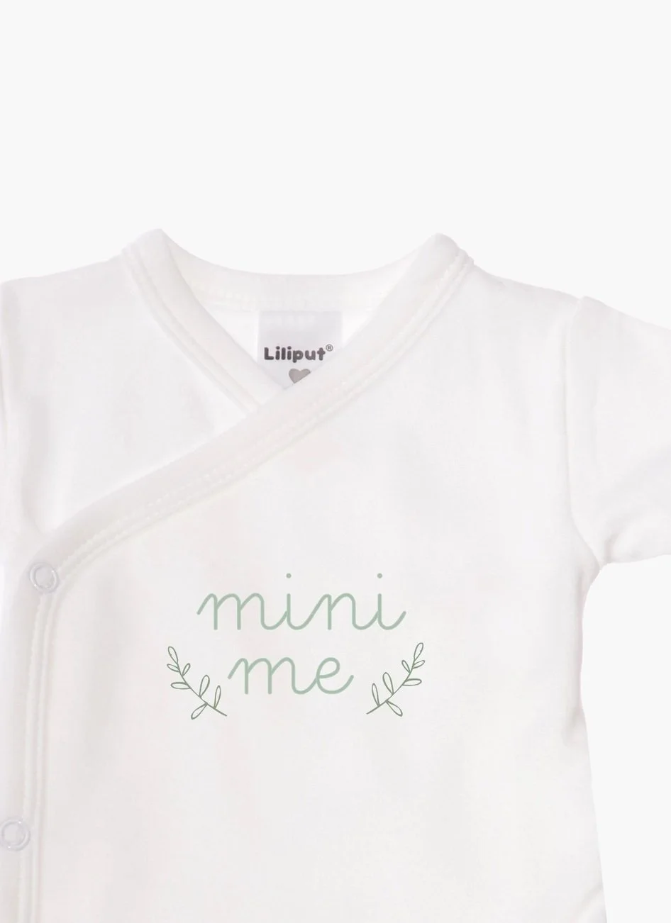 Cute 2-pack wrap bodysuits in white made from soft cotton. The snug short-sleeve bodysuits feature the subtle prints "mini me" and "little one" in a gentle mint green.